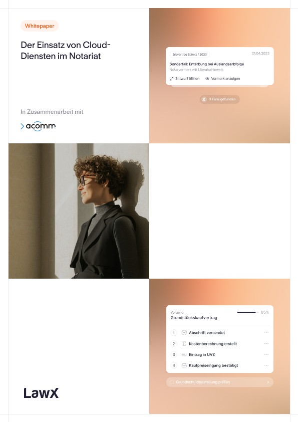 In unserem Whitepaper „Der Einsatz von Cloud-Diensten im Notariat – Gestaltungsmöglichkeiten und Grenzen“ haben wir in Zusammenarbeit mit dem führenden bayerischen IT-Dienstleister acomm die wichtigsten Punkte praxisnah zusammengefasst: